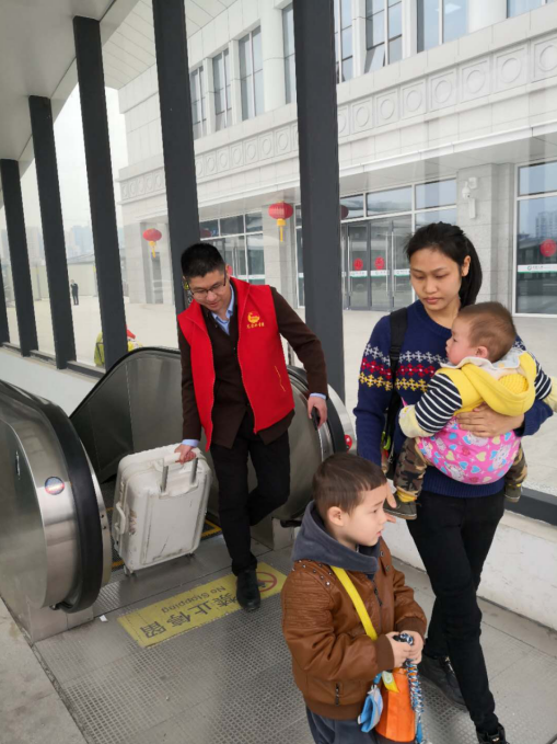在火車站服務最需要幫助的有三種人:一種是殘疾人,一種是老年人,另外一種就是一手抱著小孩一手提著行李的旅客因新建火車站剛剛啟用,“請問進站口在哪兒?一位拿著大包小包還帶著孩子的旅客問到。“在這邊,我來幫你。”志愿者一邊指著路一邊接過旅客手中的包,一路將她送至進站口